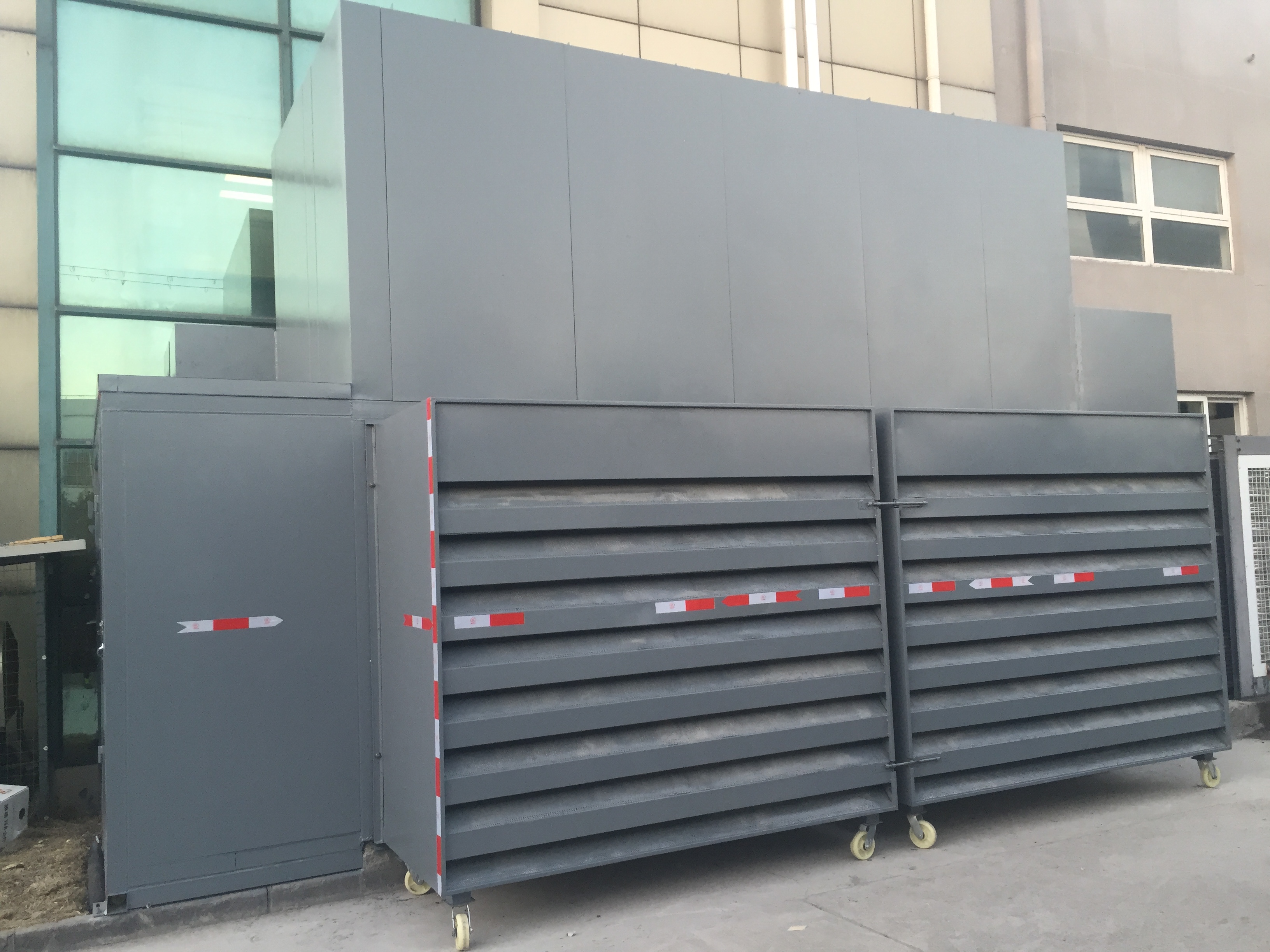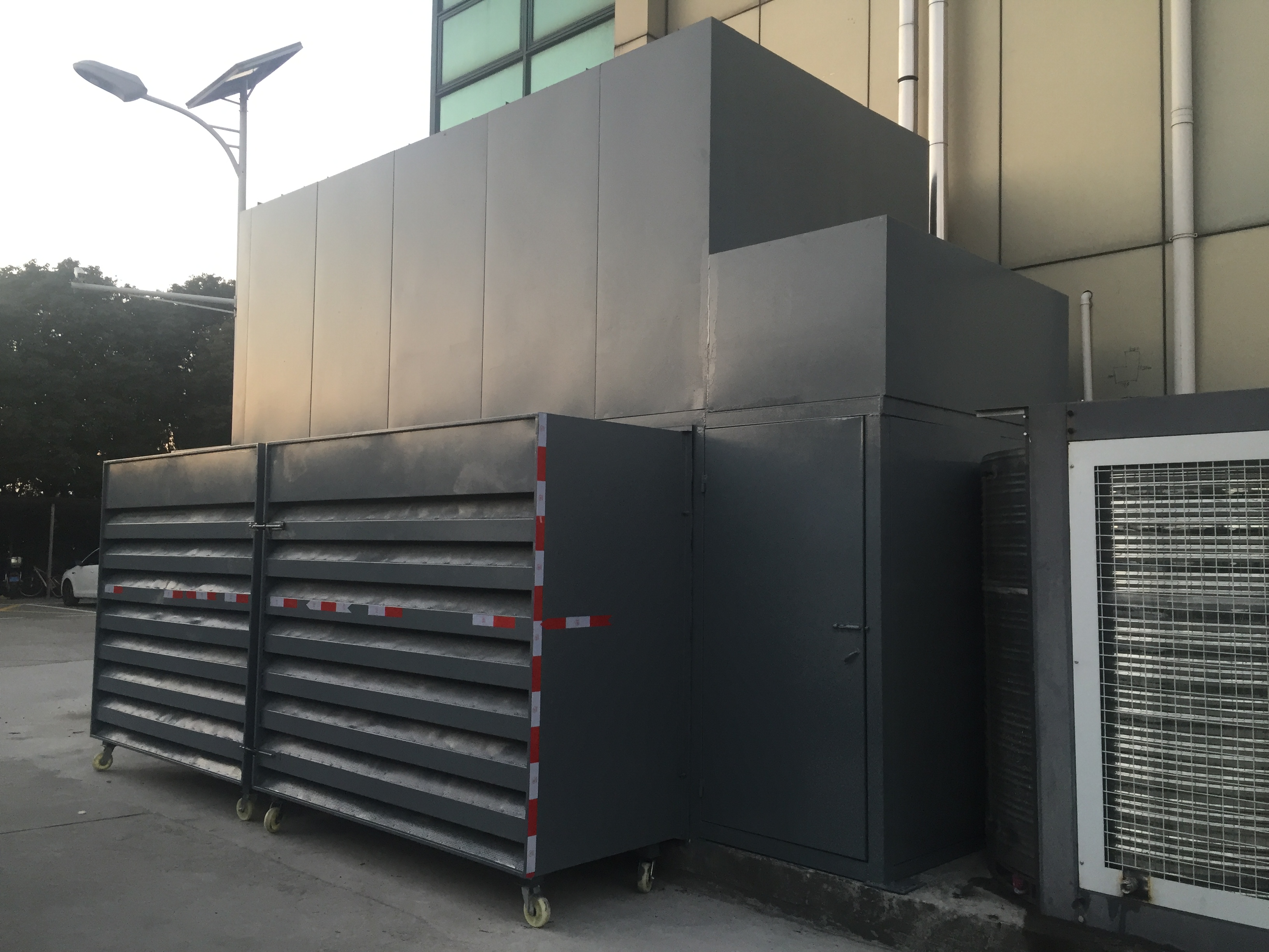 空(kōng)調外(wài)機整體降噪設施由出風消聲器、補風消聲器、進風消聲百葉及附屬(shǔ)檢修門組成。